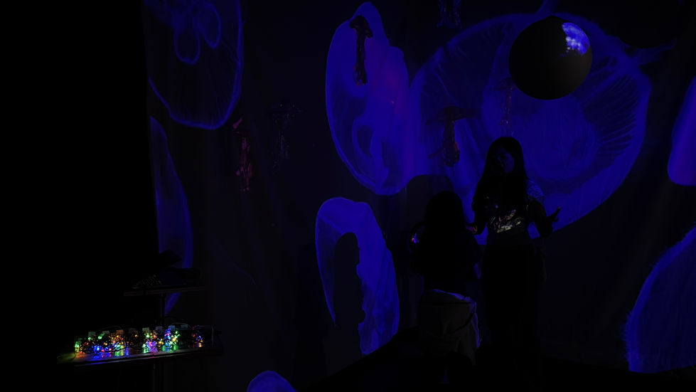 Footage from aquariums, candid recordings, and motion graphics drifted across layered planes, merging memory, light, and space. The custom MIDI controller, built for Ephemerality, was repurposed to manipulate jellyfish visuals in real-time, adjusting speed, color, and patterns using MadMapper. Experienced by 400+ visitors, the piece invited curiosity and interaction, with children finding it playful and engaging, while others described it as calming and meditative.